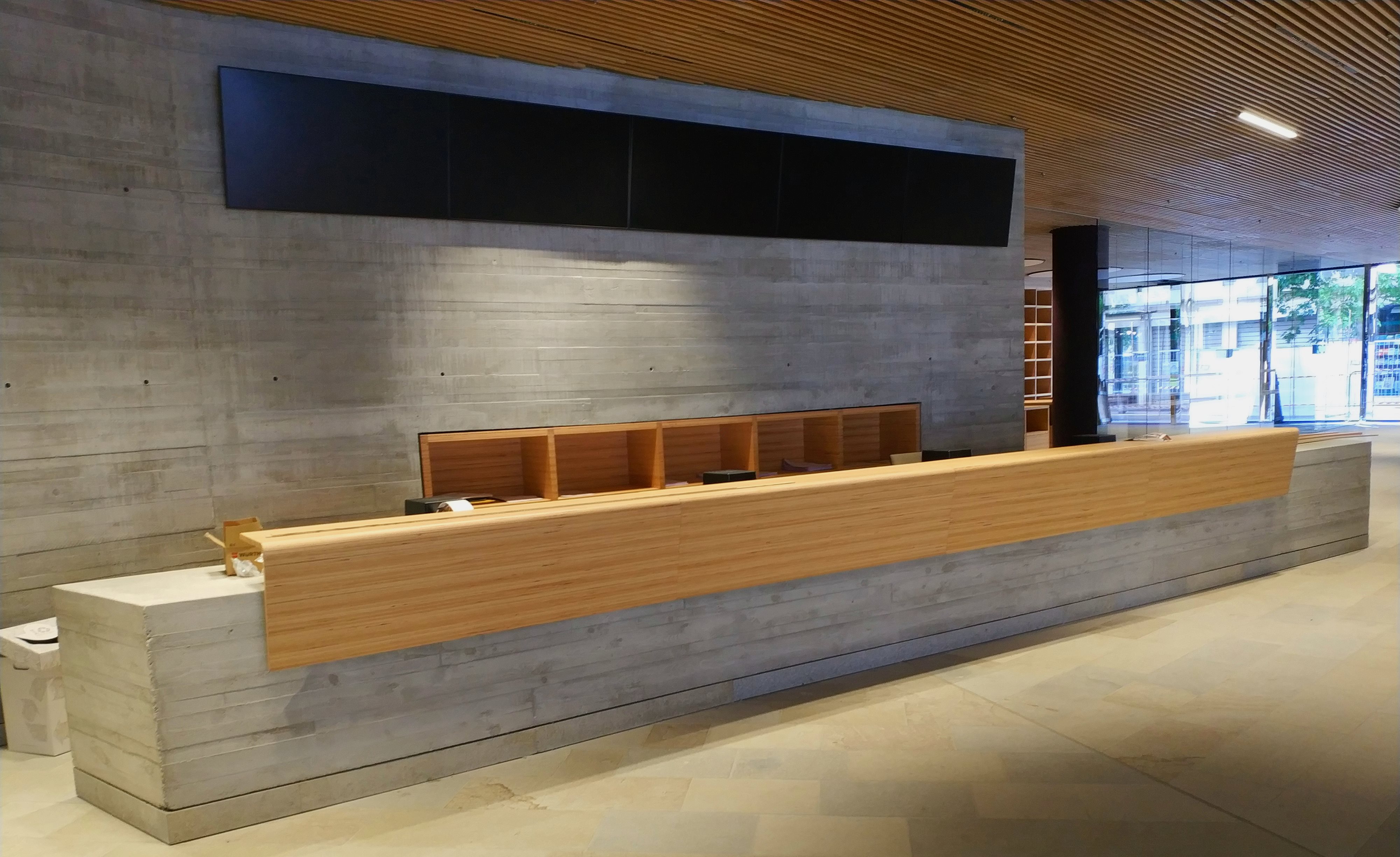 M9 Reception – Bancone Reception biglietteria in cemento armato gettato con rivestimento in pannellature curve ricavate dal pieno in Baubuche