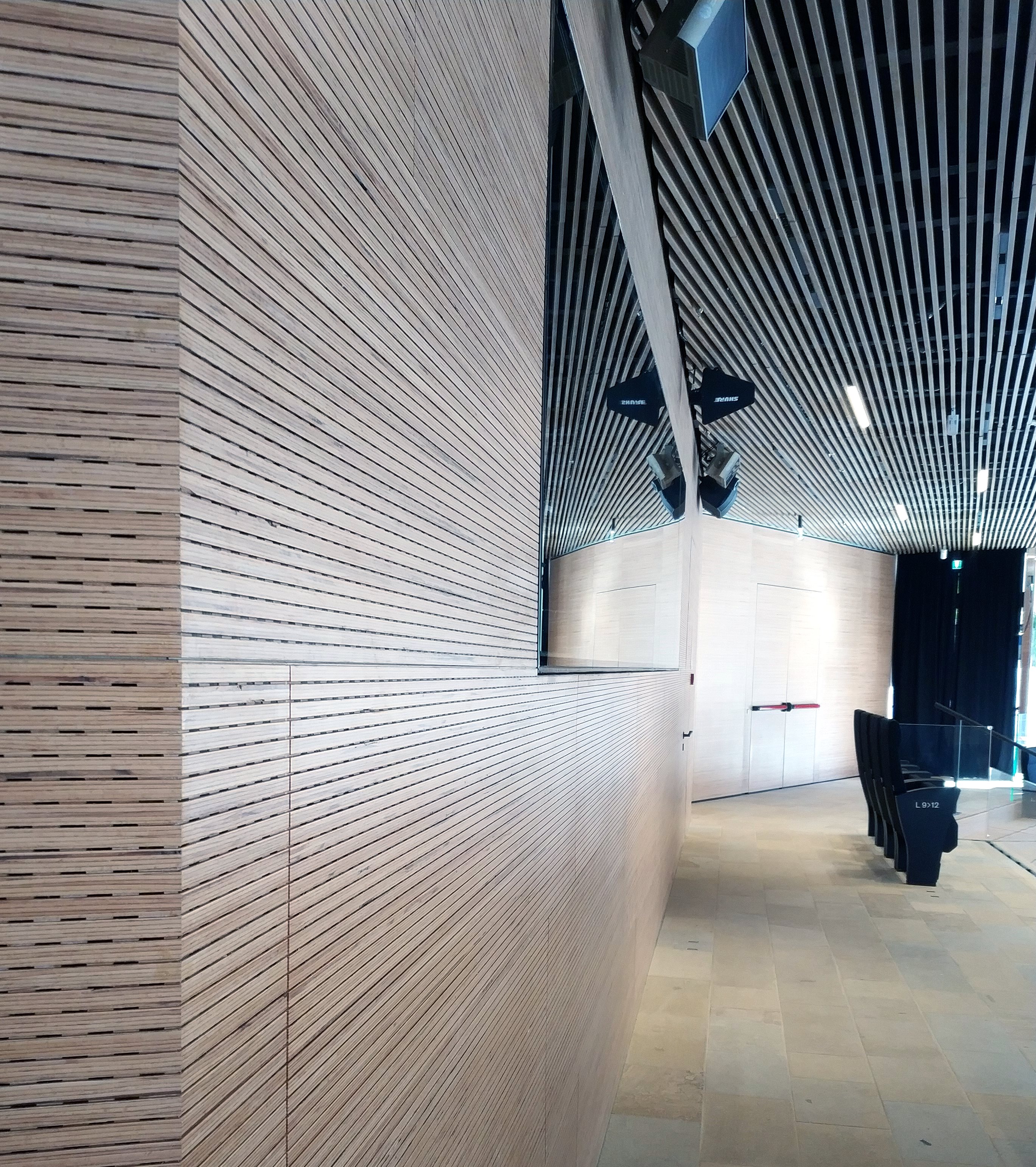 Immagine precedente Immagine successiva regia M9 – Regia Sala Polivalente rivestimento in pannellature acustiche Milacustik fresate